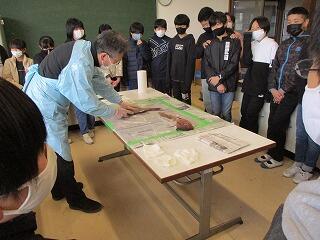 今日の昼休みにタイ・アサリ授業のパート2を行いました。午前に魚博士になった教頭先生が、午後は魚の三枚おろしをしながら魚のつくりを説明してくださいました。魚の頭が切り落とされたときは「わぁー!」という声が聞かれました。三枚に下ろされた魚の骨もしっかり観察しました。