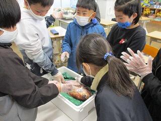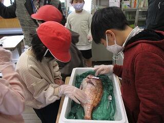 2月17日(木)の1,2校時にタイ・アサリの授業をしました。このタイやアサリは、魚食普及推進センターからいただいた物です。授業では魚や貝のつくりを学んだり、触ったりしました。子どもたちは知っている知識を総動員しながら、興味津々触れたり考えたりしていました。