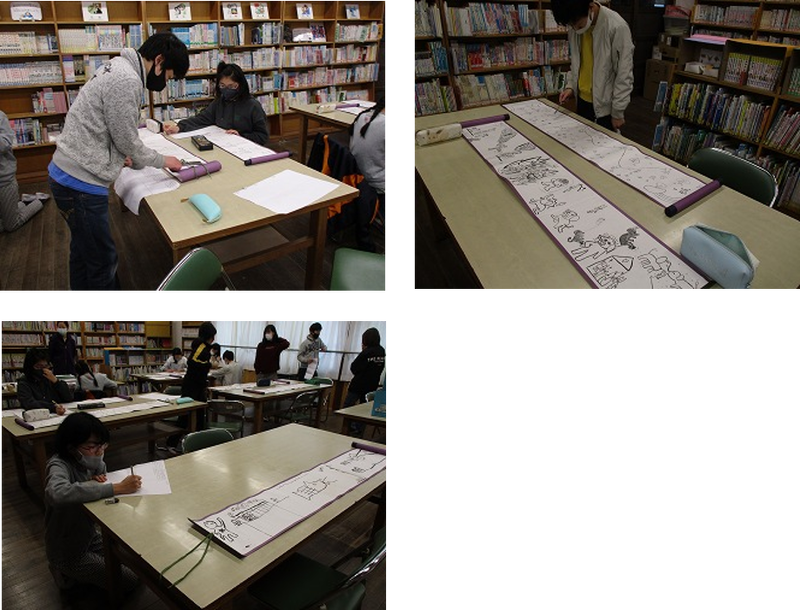6年生は、国語科の「鳥獣戯画を読む」学習の発展的学習として、各自が考えたストーリーを巻紙に水墨画で描きました。今日(12月23日)は、その完成した絵巻物のストーリーを友達が読み解いていきました。自分の描いたストーリーが、誰の読み解いたストーリ一に合致しているかを審査して、自分の物語を紹介します。どの絵巻物も、それぞれの個性があふれた作品で魅力的でした。
