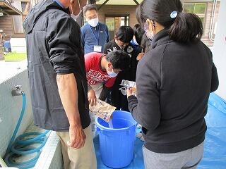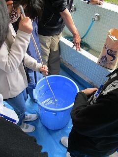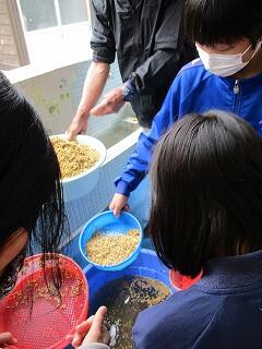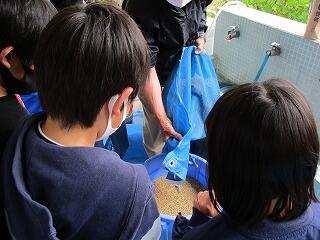 4月28日(水)の3校時に、地域の松本さんにご指導いただき、5年生が米作りのための準備を始めました。この日は良い籾を選ぶために、生卵が浮かぶくらいの塩水を作って籾を入れ、浮かんだ籾をすくっていきました。そして、沈んだ良い籾を種籾にして籾まきをして苗を育てていきます。5年生の子どもたちは、やりたい!やりたい!と意欲満々、協力しながら作業をしていました。
