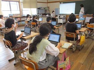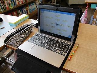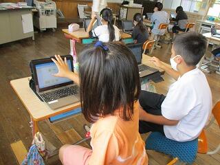 4年生がタブレットを使って、「地球」から連想するイメージマップを作りました。「地球」-「海」-「夏休み」-「花火」など、子どもらしい連想で、イメージが広がっていきました。