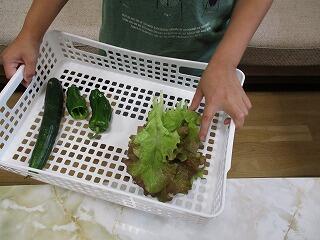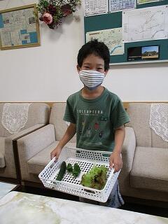 6月28日(月)、朝元気な声で「畑で採れました!」と、収穫した野菜を嬉しそうに見せに来てくれました。草引きや水やりなど、これまでお世話して収穫できるとうれしさも倍増です。ぴかぴか光った採れたて野菜は、とても美味しそうでした。