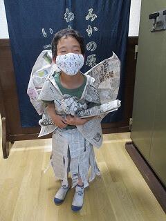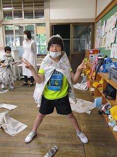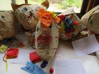 6月25日(金)の参観日には、子どもたちの作品をたくさん見ていただきましたが、教室や廊下には子どもたちの作品が展示されています。どの作品も、子どもたちの思いがこもっている工夫された作品ばかりです。今回は、2年生の「くしょくしょぎゅっ」の作品と「新聞でへんしん」を紹介します。