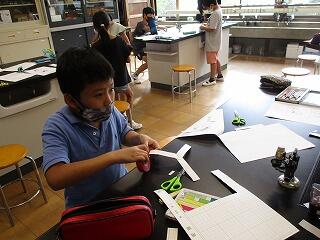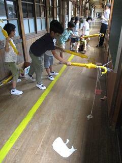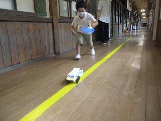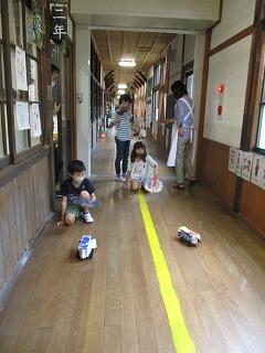 2年生は、生活科の学習で手作りのおもちゃを作っています。ぴょんぴゅんガエルに魚釣り、今日は風で動く車づくりをしました。飾りつけをしながら、実際にうちわであおいで走らせてみると、すごいスピードで廊下を進みでとても嬉しそうでした。
