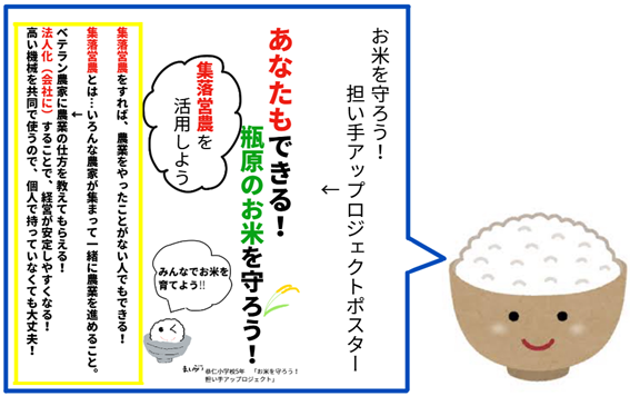 そこで、地域の米作りの担い手不足の課題を解決するため、「お米を守ろう!担い手アップロジェクト」を立ち上げ、こうしたら自分たちもお米づくりを「やってみよう」と思えるような解決策を考えました。内容は、仲間と米作りを行う集落営農や法人化、お米のブランド化やその魅力を伝える試食です。実際に私たちも試食すると、瓶原のきぬむすめの上品な甘さや、冷めてもとても美味しいことが分かったので、試食でこの良さを広めていきたいと思っています。 お米づくりの課題やその解決策について、子どもも興味が持てるように紙芝居で紹介する準備をしている他、このような考えをより多くの人に宣伝するための活動も考えています。