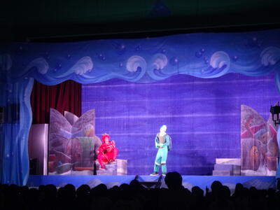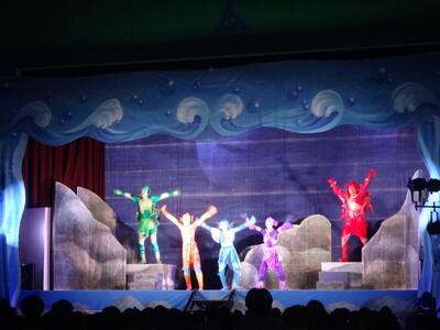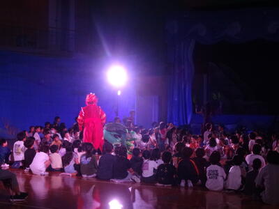 芸術鑑賞会として、劇団「夢団」の方々に来ていただき、1,2,3年生と4,5,6年生の二部制で体育館にて演劇の鑑賞をしました。演目はアクアリウム・ミュージカル『虹色サンゴ』。海の中で小さな魚たちが大きな冒険をするお話です。命の大切さや仲間を思う気持ちがたくさんつまっていました。プロジェクションマッピングにより体育館がまるで海の中にいるようでした。