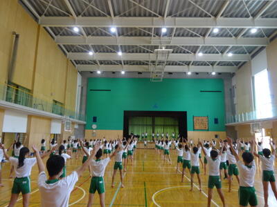 6年生が、体育館で運動会にむけての表現運動(組体操)をがんばって練習しています。心を一つにして技を決めていきます。小学校生活最後の運動会です。思い出に残るようがんばってほしいと思います。6年生も『ラジオ体操』を行っていました。さすが6年生、動きのキレがちがいました。