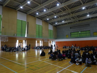 来週の26日(木)に行われる『6年生を送る会』に向けて各学年準備を進めています。『6年生を送る会』は、在校生が、卒業を迎える6年生へ感謝の気持ちを伝え、心を込めて送り出すとともに、5年生が次のリーダーとしての第一歩を踏み出す児童会行事です。今日は、在校生が体育館に集まり練習を行いました。内容は言えませんが、5年生を中心にみんながんばって取り組んでいました。