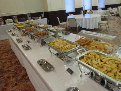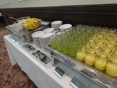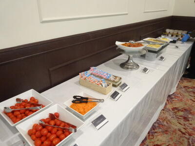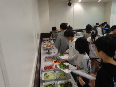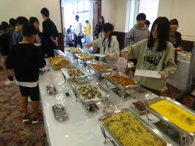 夕食の時間となっております。ブッフェ形式で取っていきます。家庭科で学んだ栄養のバランスを考えながら取り、みんなで食事を楽しむことができております。食べ過ぎには注意ですね。