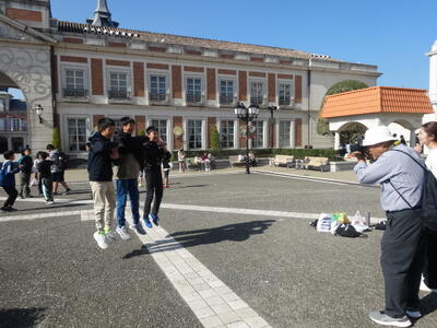 スペイン村に入りました。雲一つない快晴です。日本ではありますが、外国の雰囲気を味わうことができます。建物の様式など日本との違いに気づくことはできたかな。楽しみながら学んでほしいと思います。