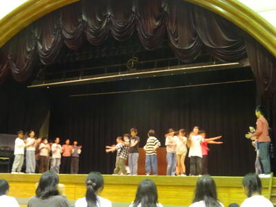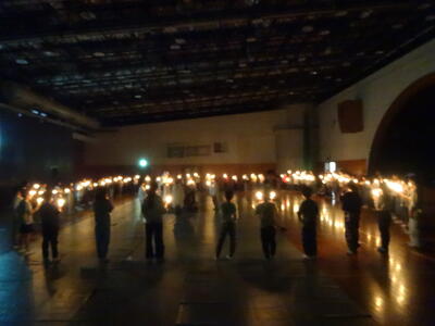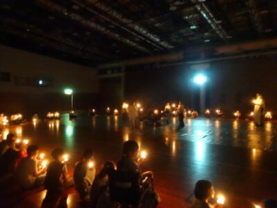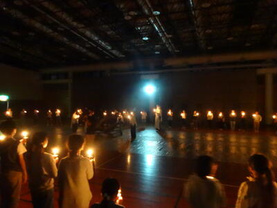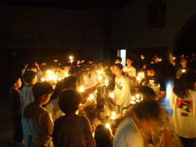 夕食を済ませ、午後6時30分より、大ホールに集まって、「キャンドルサービス」を行いました。火の神よりもらった火を点火し、一人一人が願いを込めました。その後は、各クラスの発表や、担当の出し物など、全員で楽しむことができました。