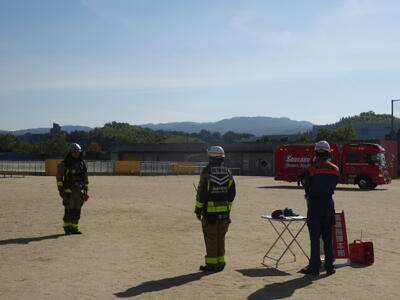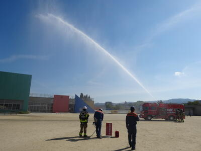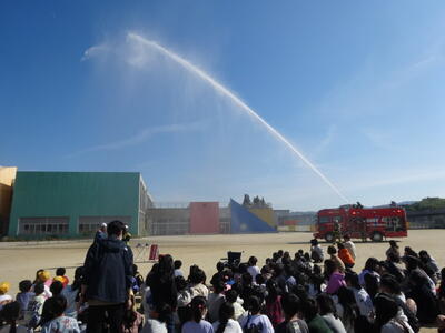 本日、避難訓練を行いました。給湯室から火災が発生した想定で、グラウンドに避難しました。消防署の方々にもきていただき合同で訓練を行いました。化学車での放水(消火)を見せていただいたり、講評をいただいたりもしました。また。6年生は、スモーク体験も行い、部屋から安全に避難する訓練もしました。みんな真剣に訓練することができていました。このように普段から備えをしっかりと行っていきたいと思います。