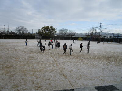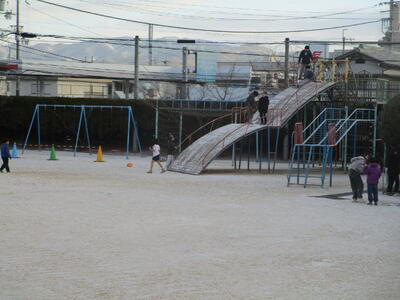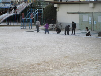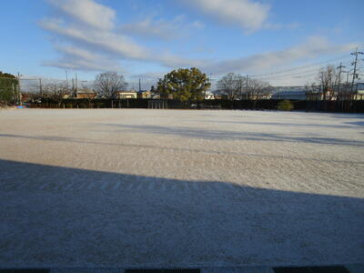 今朝、学校の運動場にはうっすらと雪が積もっていました。