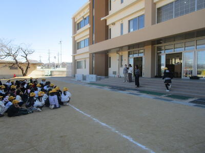 1年生の子ども達も新校舎を見ながら、体育の授業をしています。