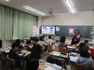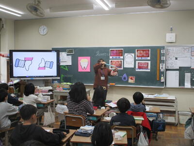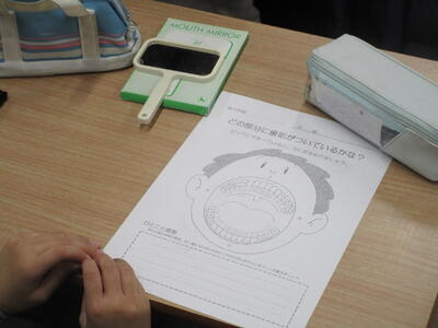 11月6日(木)3時間目、1年生は歯科衛生士や学校歯科医の先生から、むし歯予防のための歯磨きのポイントについて学びました。