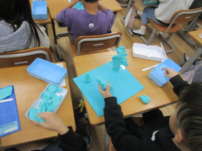 1年生の教室では、楽しそうに空き箱を使って色々な物を作っていました。