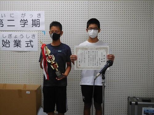 学校長の話の後、新しい先生の紹介や、夏休み中に開催された木津川市小学生ソフトボール大会の学校での表彰式等を行いました。