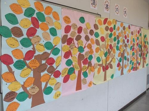 学年ごとに繁らせた「読書の木」が完成しました。図書室前に掲示しています。