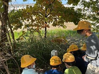 1年生の生活科「あきとなかよし」」の学習で、ビオトープを観察し秋のものを見つける活動をしました。夏に見に行った時の様子と比べながら、見つけた落ち葉の色や木の実、夏にいた虫がいるかどうかなどじっくりと観察していました。