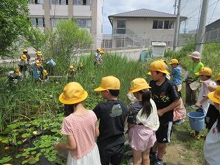 5月29日(木)に、5年生が学校ビオトープで田植え体験をしました。