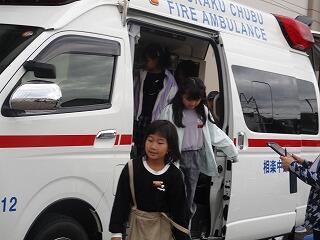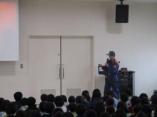 消防士の仕事や訓練について説明を聞き、救急車や消防車(化学車)の見学、スモーク体験を行いました。スモーク体験では、口を覆わず煙を吸うと咳き込んでしまうことや消防士は真っ白で視界が悪いところで活動されていることに気づく機会になりました。子どもたちは、消防士の方々の話を興味を持って真剣に聴き、メモをたくさん取っていました。楽しく勉強になる出前授業でした。