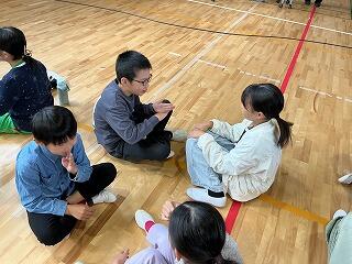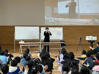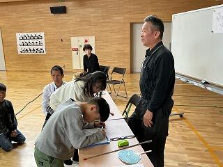 手話を用いた簡単な会話や筆談を教えてもらい、近くの友達と手話で挨拶をしたり、松下さんと筆談をしたりして言葉以外で会話する体験を行いました。手振りだけではなく表情や口の動きもつけて行うと相手に伝わりやすいことを聞いて一生懸命取り組む姿が印象的でした。