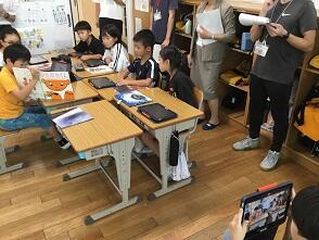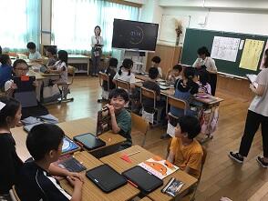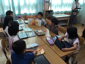 3年花組の授業の様子です。iPadを活用して、話す力を伸ばしています。