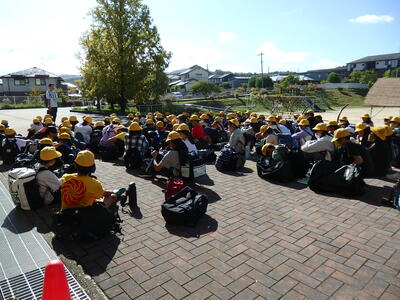 学校で地震が起きた時には命を守る最優先の行動をすべく避難訓練を行いました。