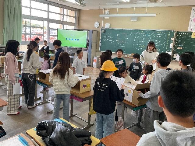 実際の1年生の教室で、5年生のお兄さんお姉さんたちと工作をしました。(来年はそれぞれ1年生と6年生になって、交流することも多くなります)