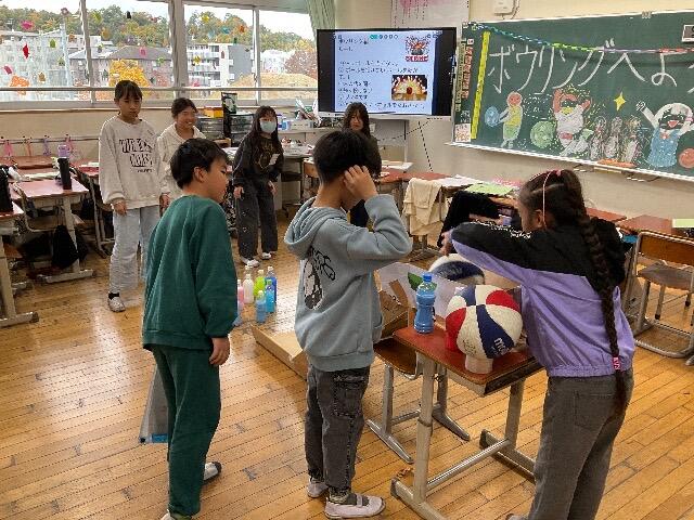 5年生はボーリング。クラスによってボーリングのやり方が違い、それぞれ工夫されていました。写真は段ボールでボールを転がす装置を作った5年4組の様子です。あまり倒れなかった時は、こっそり店員さんが倒してくれるサービス(?)付きの素敵なボーリング場でした。